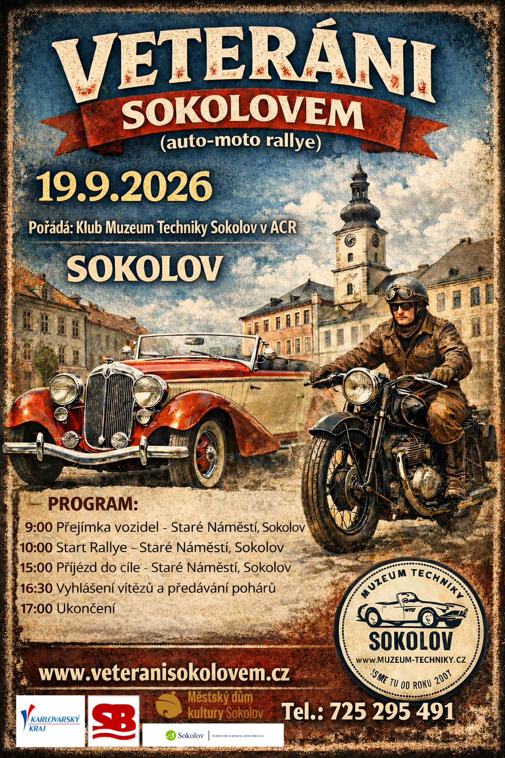 Vážení přátelé motorismu a historických vozidel. Srdečně Vás zveme na první ročník Veteráni Sokolovem. Projedeme Sokolovem, kde absolvujete tři kontrolní body a další tři kontrolní body budou mimo Sokolov v přilehlých městech nebo obcích. V rámci rallye si dáme výborný oběd a posilující svačinu.